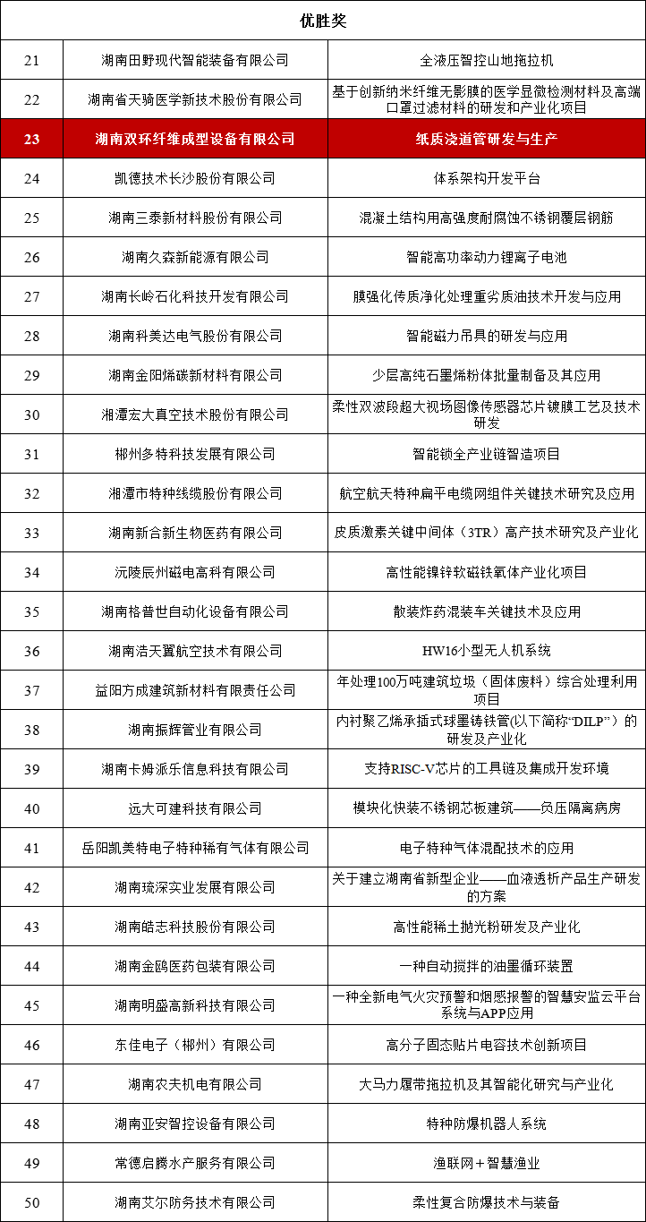 近日,湖南省工信廳公布了2020年“創(chuàng)客中國”湖南省中小微企業(yè)創(chuàng)新創(chuàng)業(yè)大賽決賽獲獎項目,湘潭高新區(qū)企業(yè)湖南雙環(huán)纖維成型設(shè)備有限公司的“紙質(zhì)澆道管研發(fā)與生產(chǎn)”項目榮獲企業(yè)組優(yōu)勝獎。