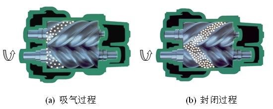 螺桿式空氣壓縮機(jī)的工作原理:電機(jī)驅(qū)動轉(zhuǎn)子,主從轉(zhuǎn)子的齒溝空間在轉(zhuǎn)至進(jìn)氣端壁開口時(shí),其空間大,外界的空氣充滿其中,當(dāng)轉(zhuǎn)子的進(jìn)氣側(cè)端面轉(zhuǎn)離了殼之進(jìn)氣口時(shí),在齒溝間的空氣被封閉在主、從轉(zhuǎn)子與機(jī)殼之間,完成吸氣過程。在吸氣結(jié)束時(shí),主、從轉(zhuǎn)子齒峰與機(jī)殼形成的封閉容積隨著轉(zhuǎn)子角度的變化而減少,并按螺旋狀移動,此為壓縮過程。在輸送過程中,容積不斷減少,氣體不斷被壓縮,壓力提高,溫度升高,同時(shí),因氣壓差而變成霧狀的潤滑油被噴入壓縮腔,從而達(dá)到壓縮、降低溫度密封和潤滑的作用。當(dāng)轉(zhuǎn)子之封閉齒峰旋轉(zhuǎn)到與機(jī)殼排氣口相遇時(shí),被壓縮的空氣開始排放,直到齒峰與齒溝的吻合面移至排氣端面,此時(shí)齒溝空間為零,即完成排氣過程。與此同時(shí),主從轉(zhuǎn)子的另一對齒溝已旋轉(zhuǎn)至進(jìn)氣端,形成大空間,開始吸氣過程,由此開始一個(gè)新的壓縮循環(huán)。